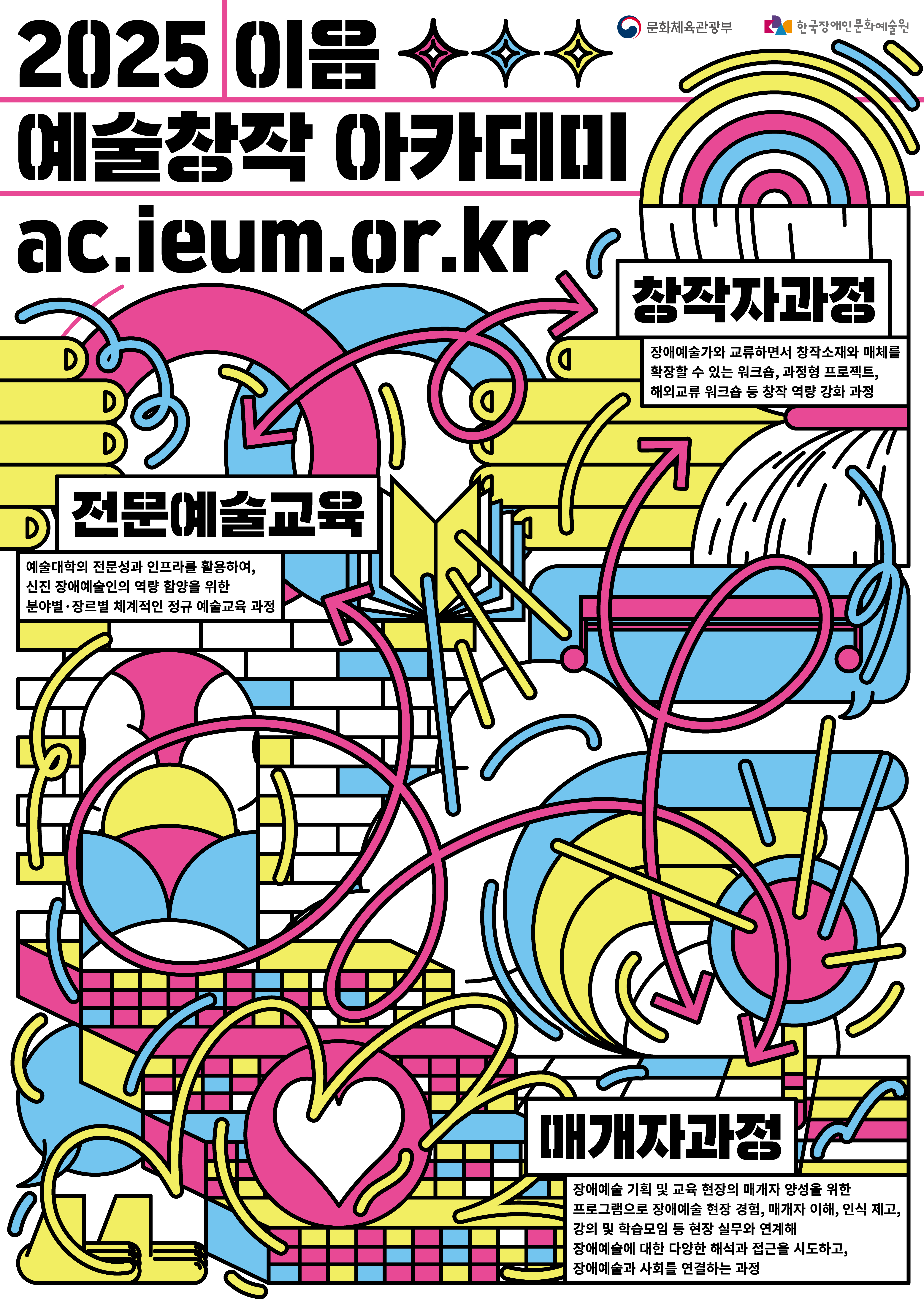 □ 한국장애인문화예술원(이하 장문원)은 장애예술인의 창작 역량 강화와 더불어 매개자·접근성 매니저 등 전문 인력 양성을 위해 ‘2025 이:음 예술창작 아카데미’를 운영하고 있으며, 9월부터 시작되는 하반기 과정 참여자를 모집한다.