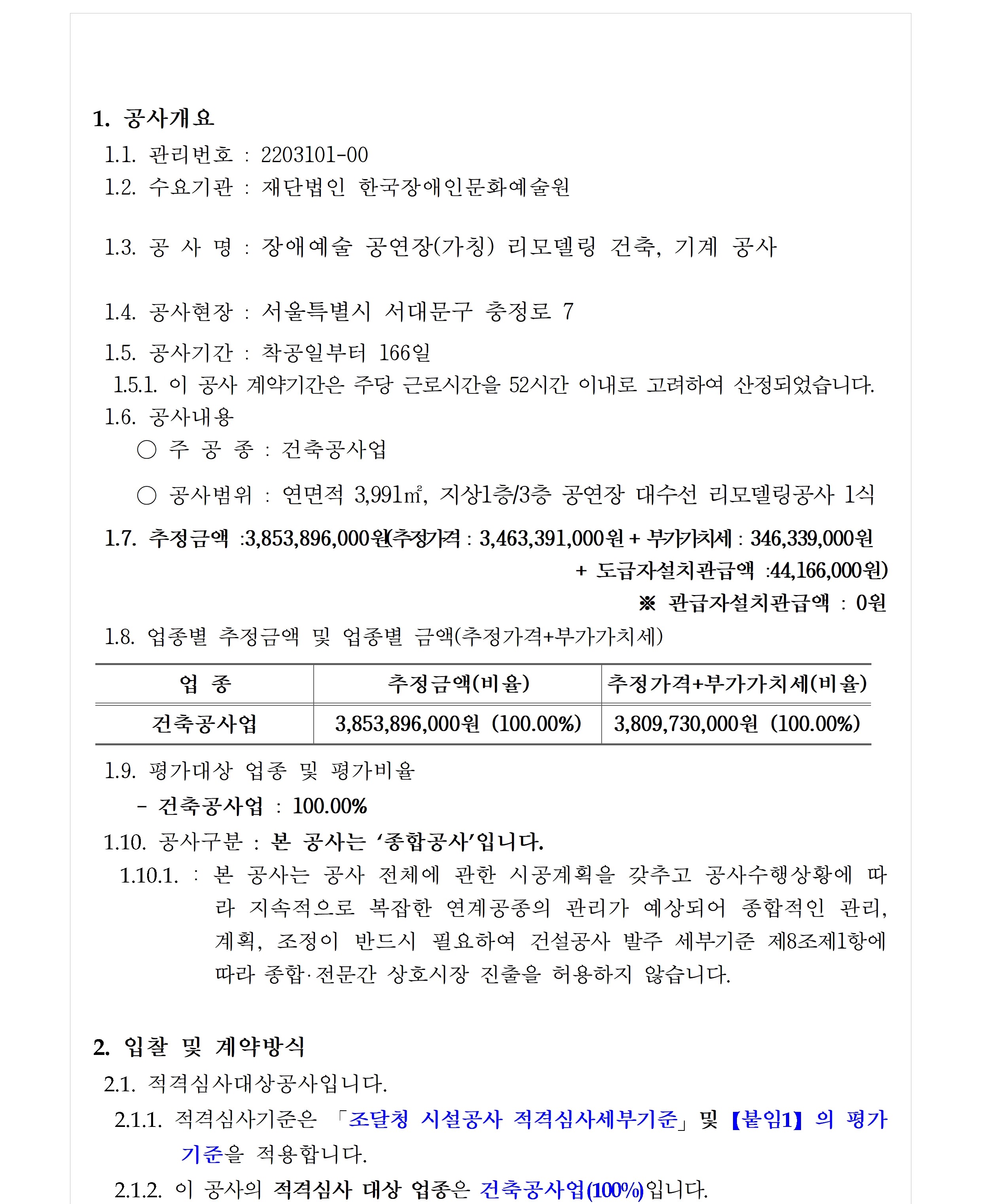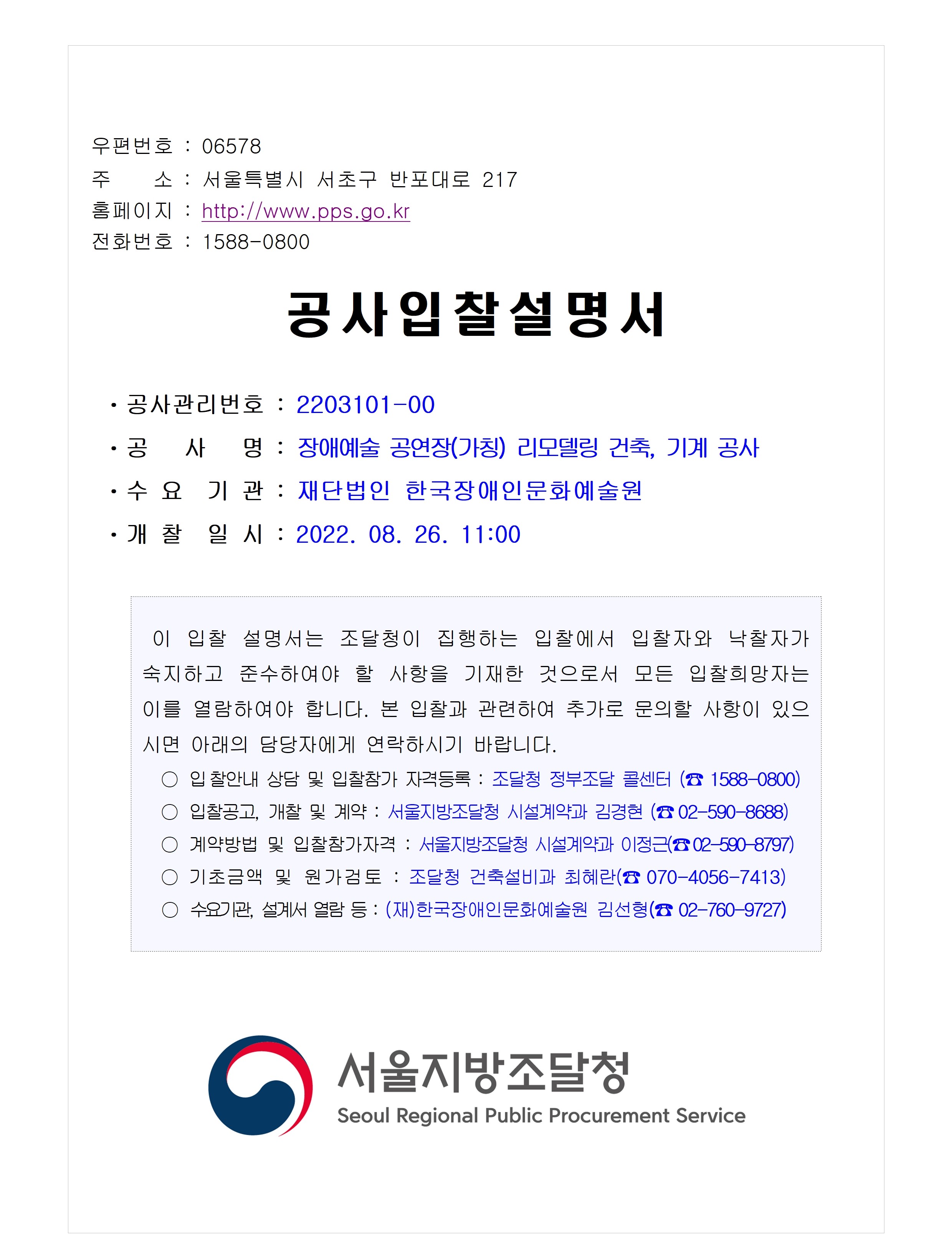 [제2022-014호] 장애예술 공연장(가칭) 리모델링 건축, 기계 공사 입찰 공고