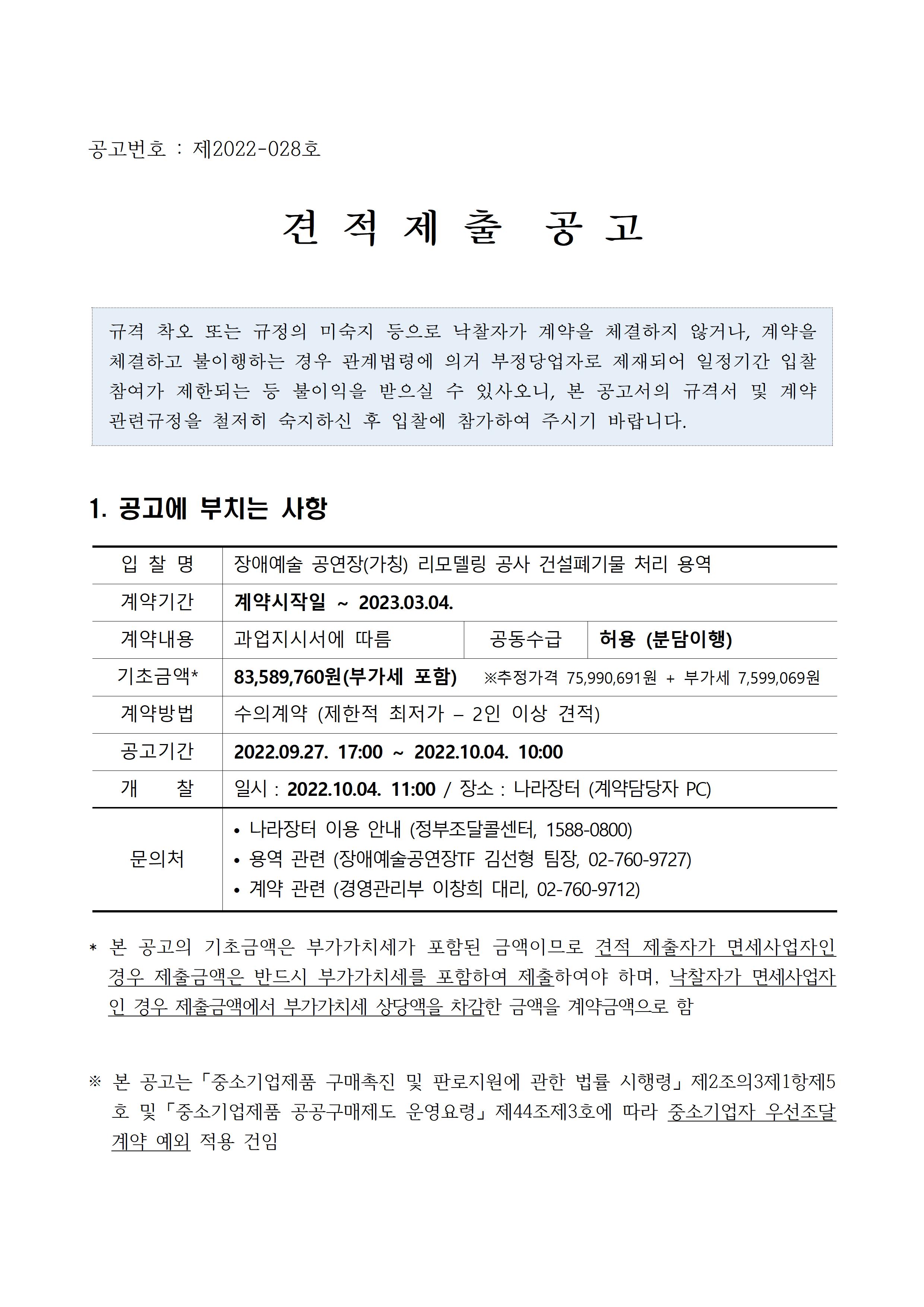 붙임1. 견적공고문_장애예술 공연장(가칭) 리모델링 공사 건설폐기물 처리 용역.hwp