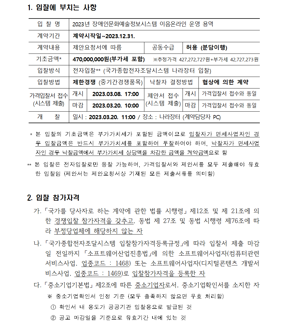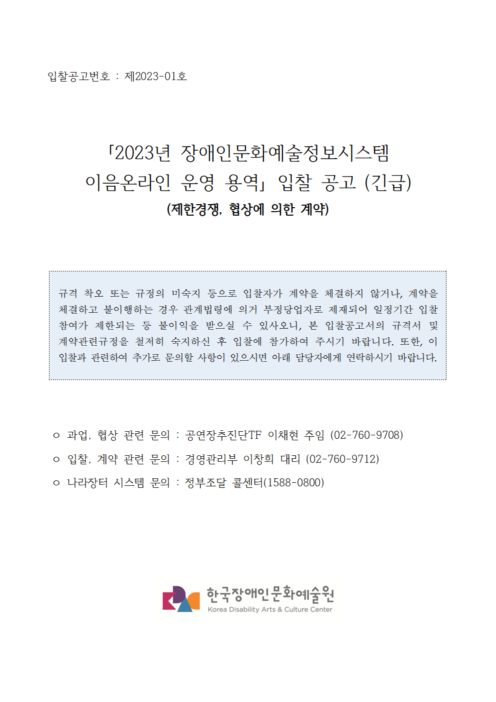 붙임1. 입찰공고문_2023년 장애인문화예술정보시스템 이음온라인 운영 용역.hwp