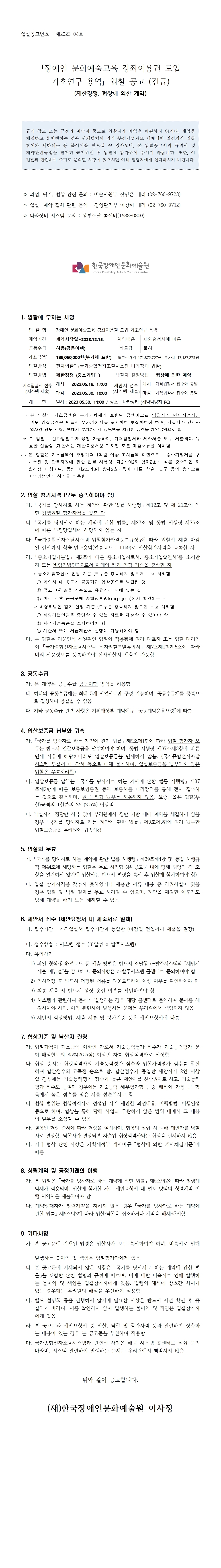 붙임1. 입찰공고문_장애인 문화예술교육 강좌이용권 도입 기초연구 용역.hwp