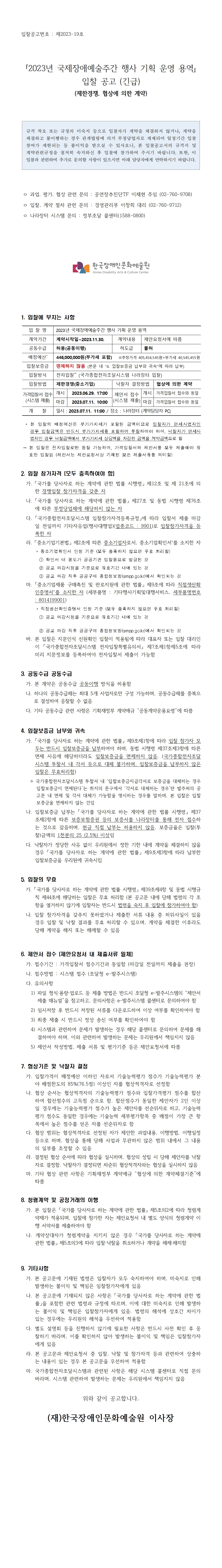 붙임1. 입찰공고문_2023년 국제장애예술주간 행사 기획 운영 용역.hwp