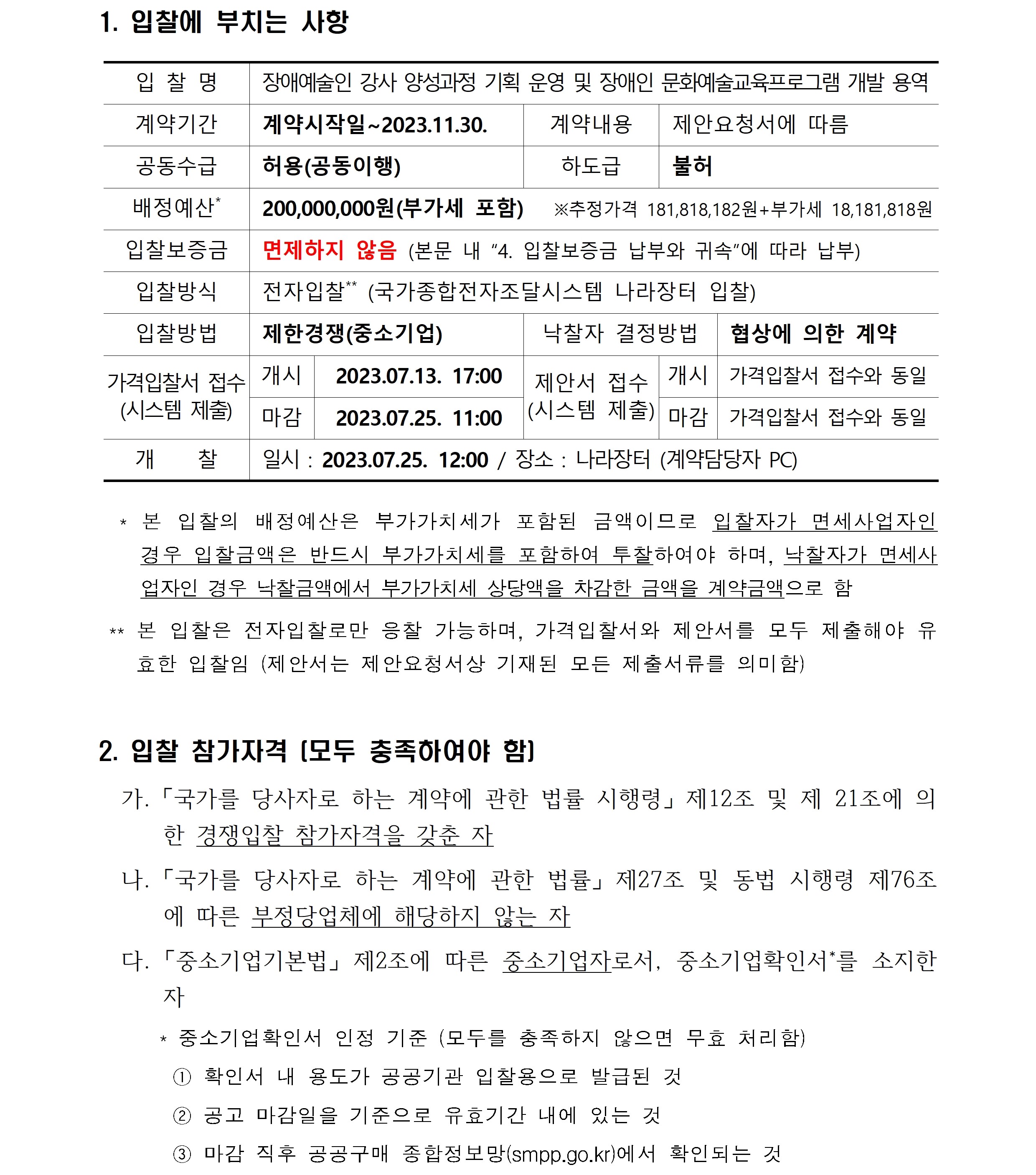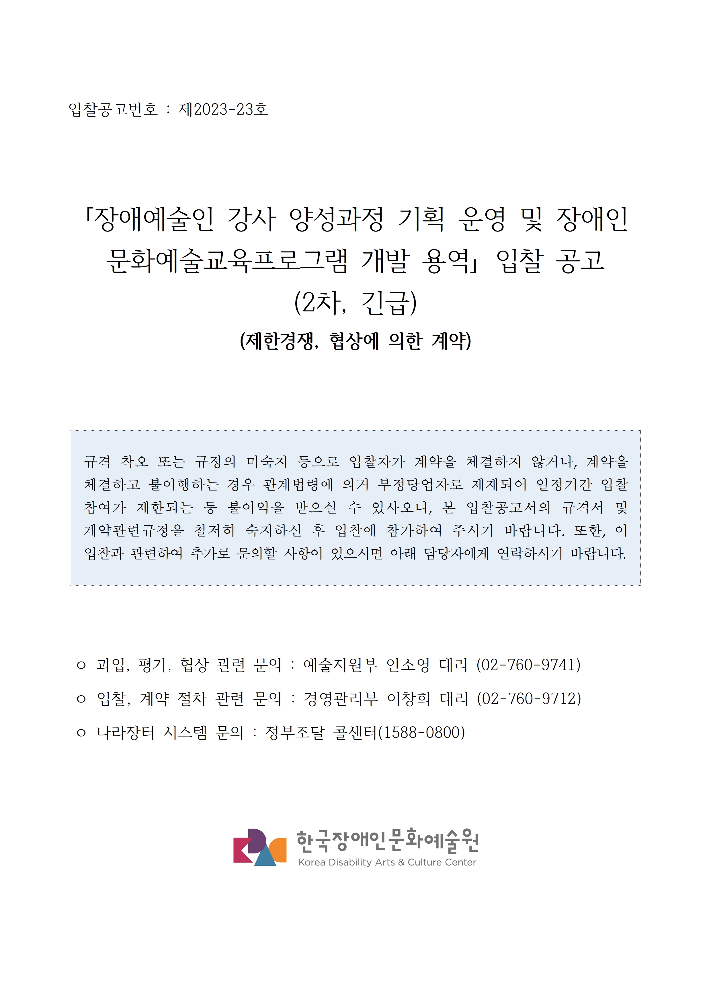 붙임1. 입찰공고문_장애예술인 강사 양성과정 기획 운영 및 장애인 문화예술교육프로그램 개발 용역 (재공고, 2차).hwp