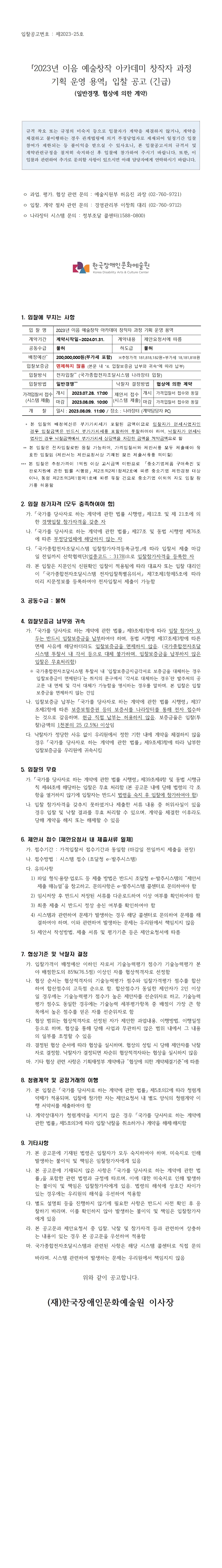 붙임1. 입찰공고문_2023년 이음 예술창작 아카데미 창작자 과정 기획 운영 용역.hwp