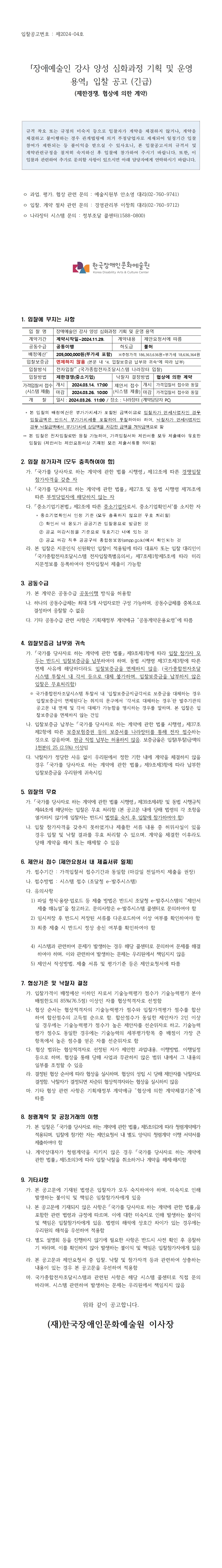 붙임1. 입찰공고문_장애예술인 강사 양성 심화과정 기획 및 운영 용역.hwp
