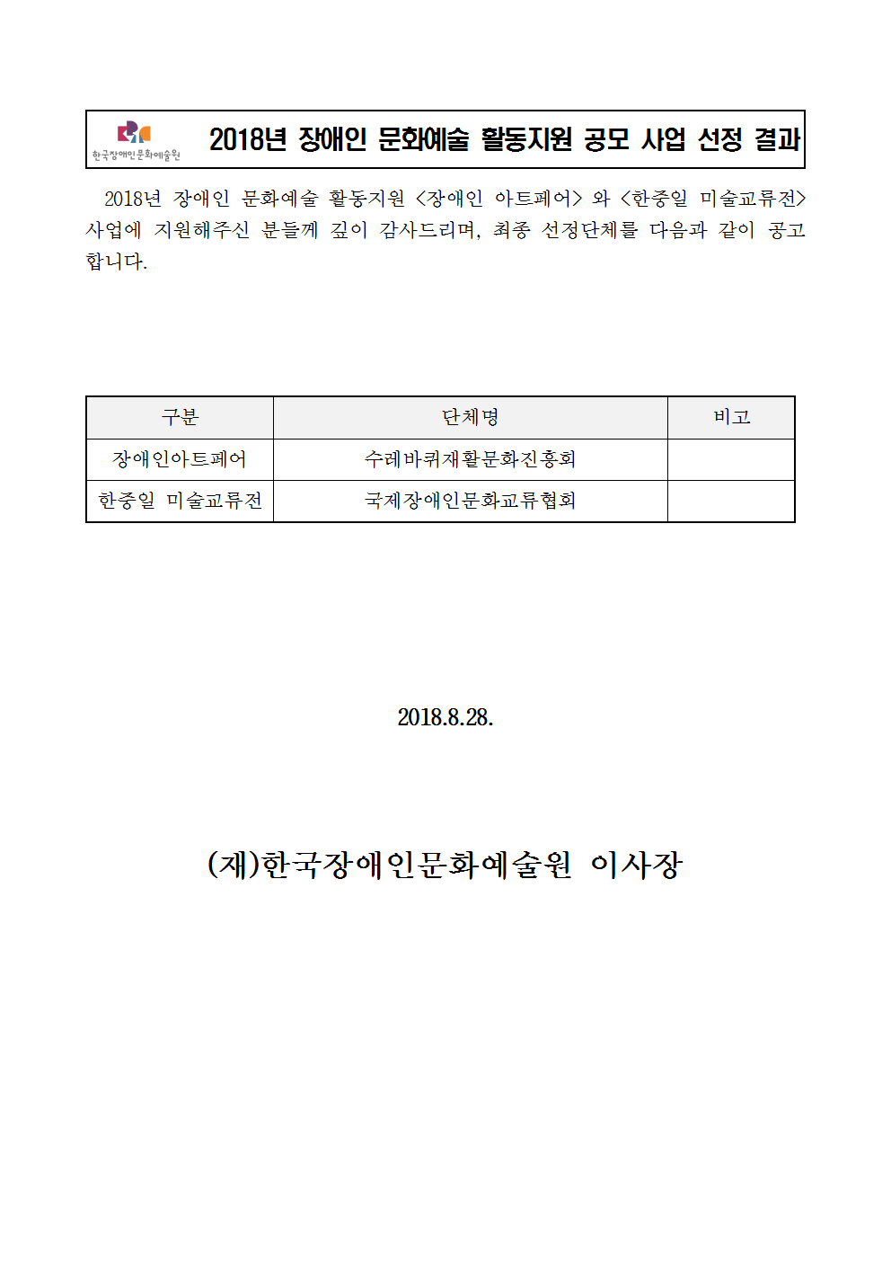 [공지] 2018년 장애인 문화예술 활동지원 공모 사업 선정 결과