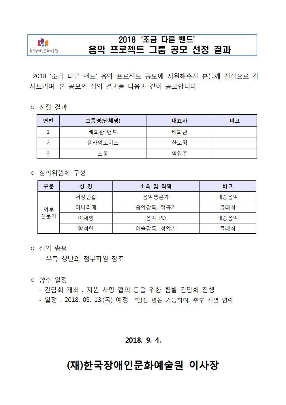 [공지] 2018 조금 다른 밴드 음악 프로젝트 그룹 공모 심의결과