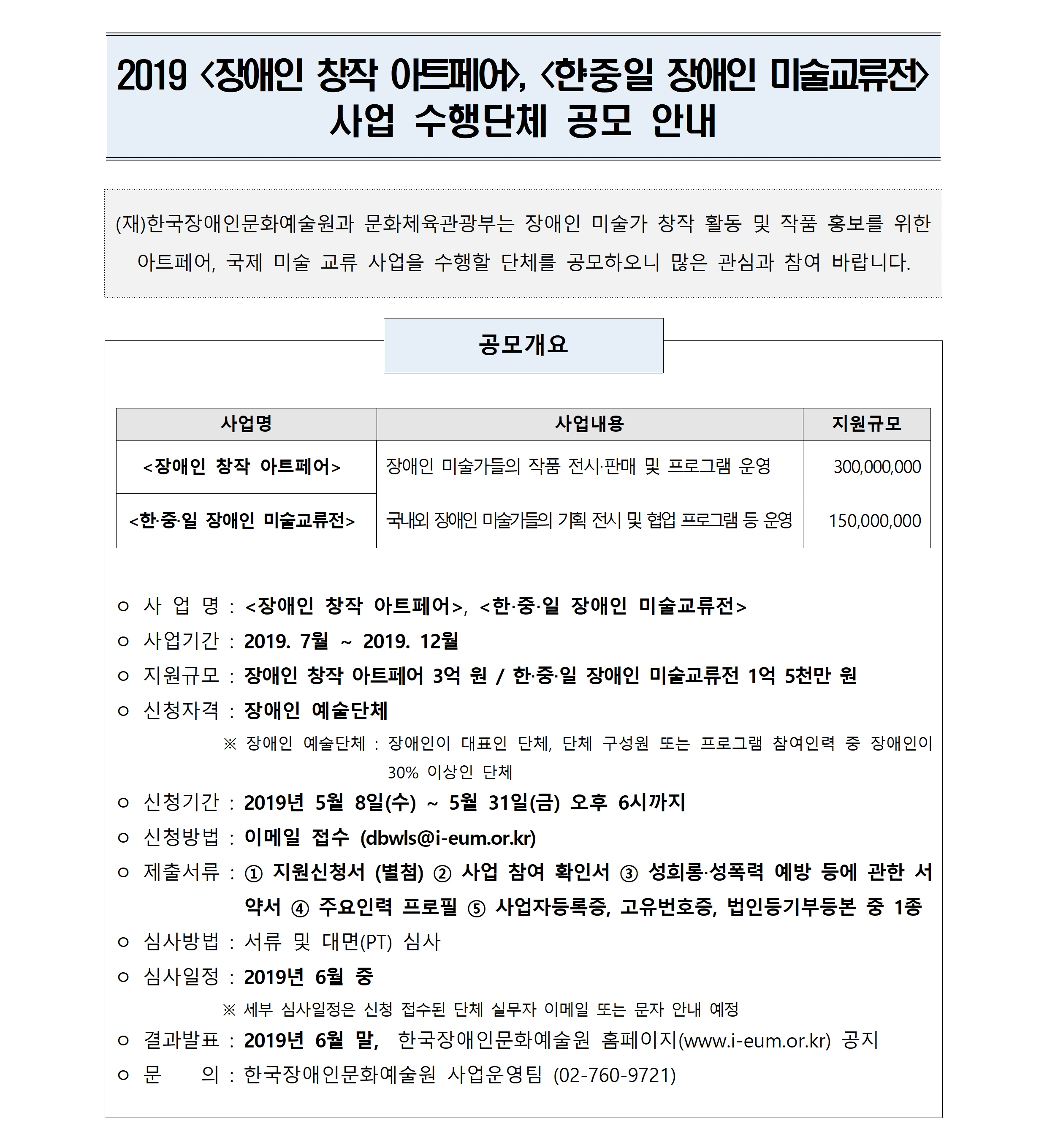 2019년 장애인 창작 아트페어, 한중일 장애인 미슐교류전 사업 수행단체 공모 안내.hwp