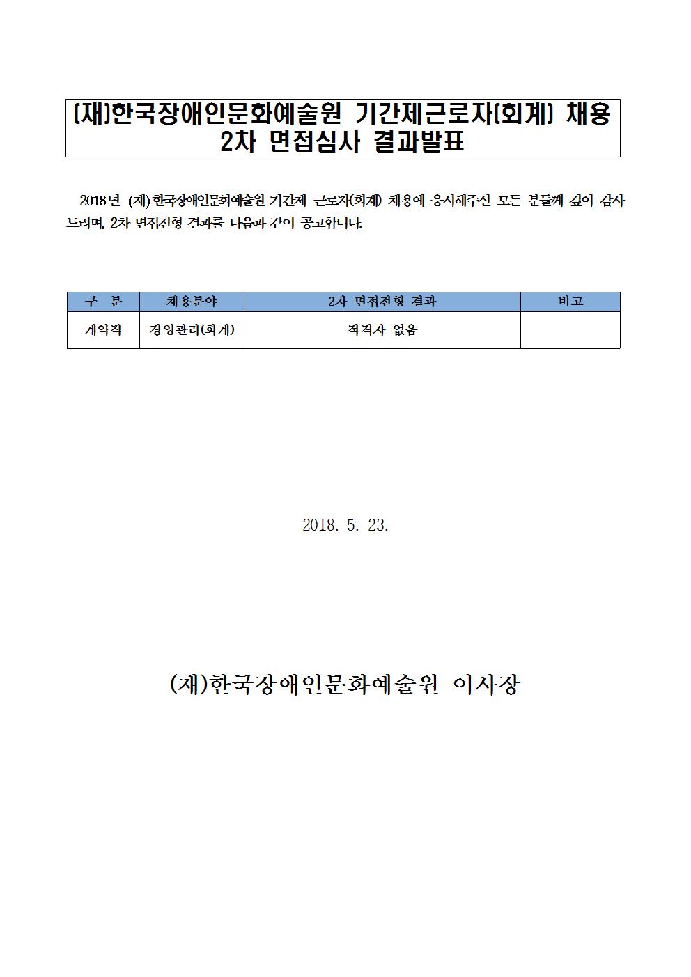 2018년 (재)한국장애인문화예술원 기간제근로자(회계) 채용 2차 면접전형 결과