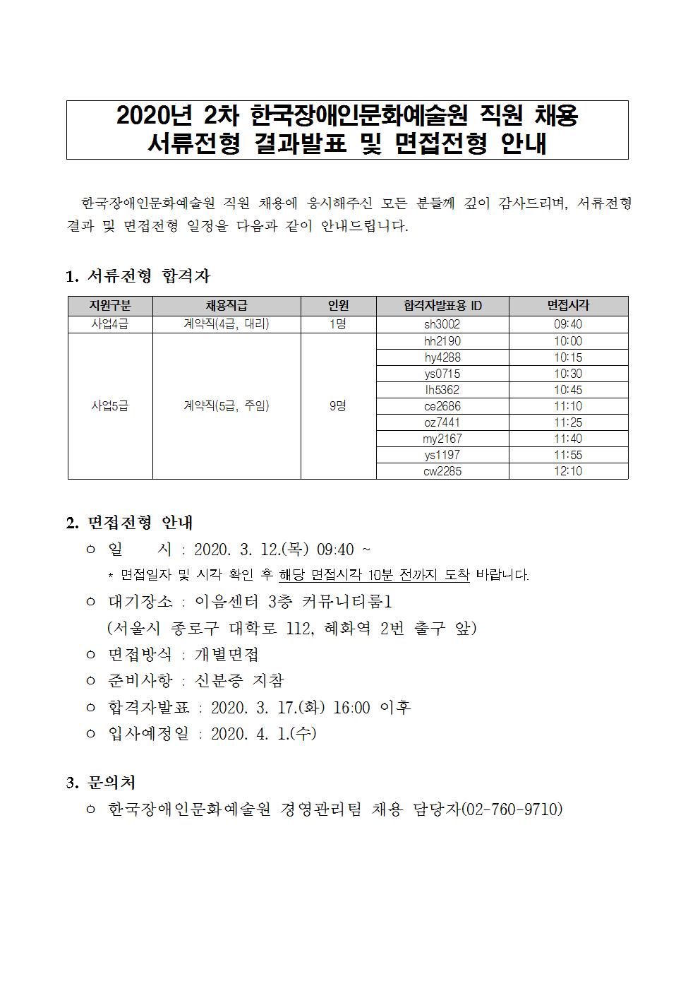 2020년 2차 한국장애인문화예술원 직원 채용 서류전형 결과발표 및 면접전형 안내