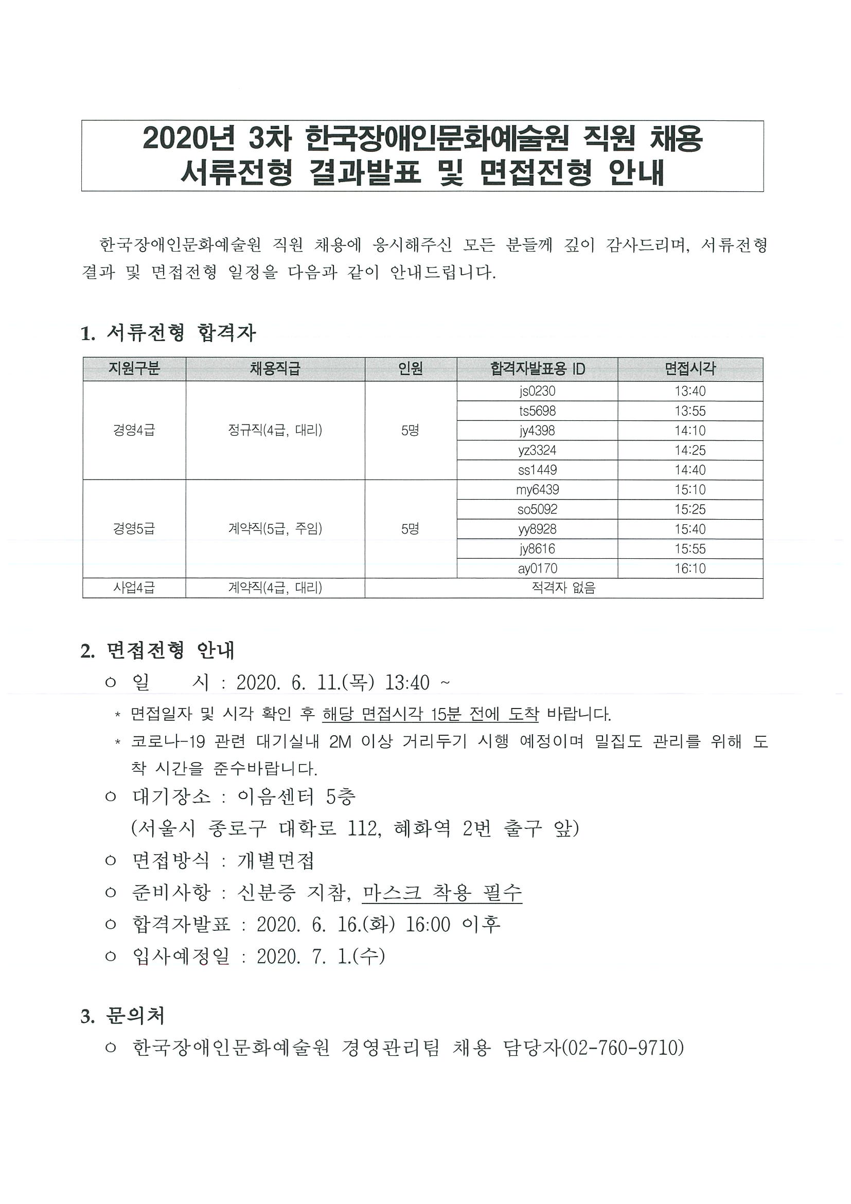 2020년 3차 한국장애인문화예술원 직원 채용 서류전형 결과발표 및 면접전형 안내