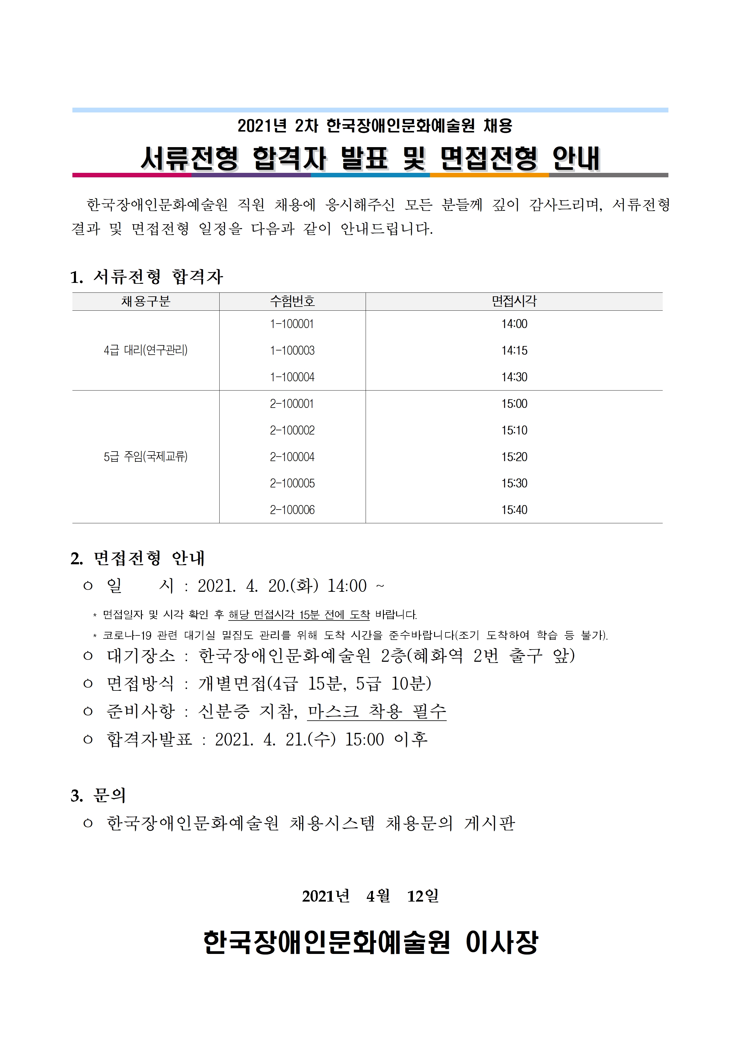 2021년 2차 한국장애인문화예술원 채용 서류전형 합격자 발표 및 면접전형 안내