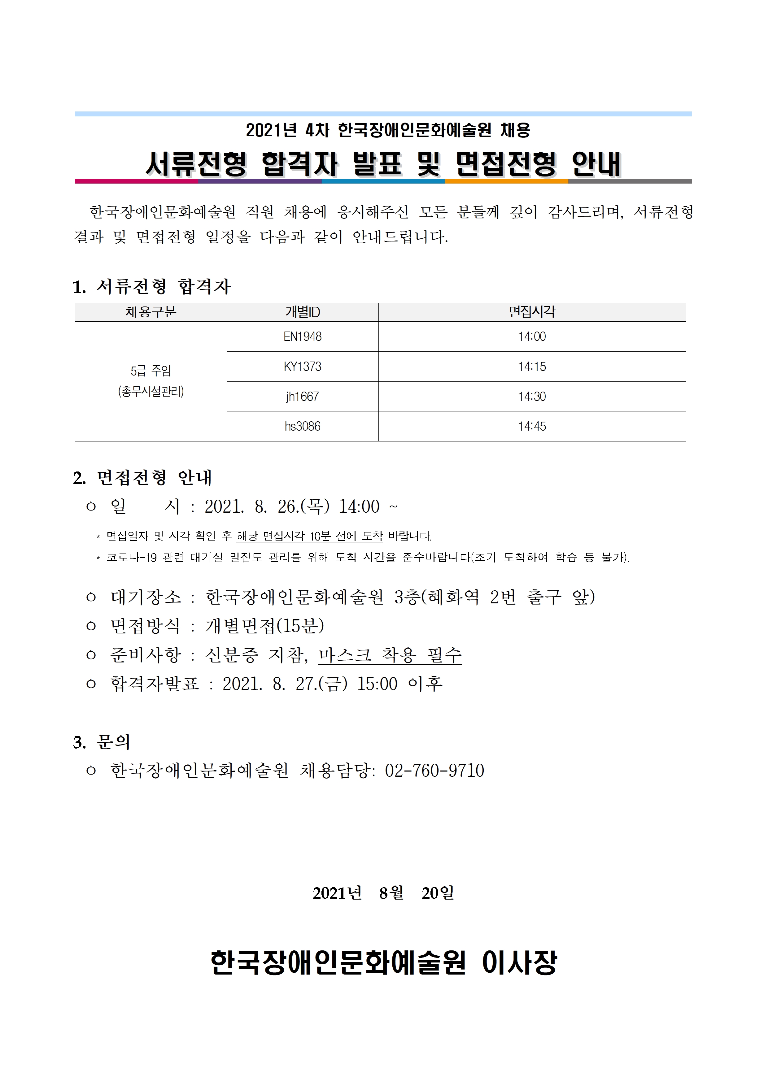 2021년 4차 한국장애인문화예술원 채용 서류전형 결과 공고