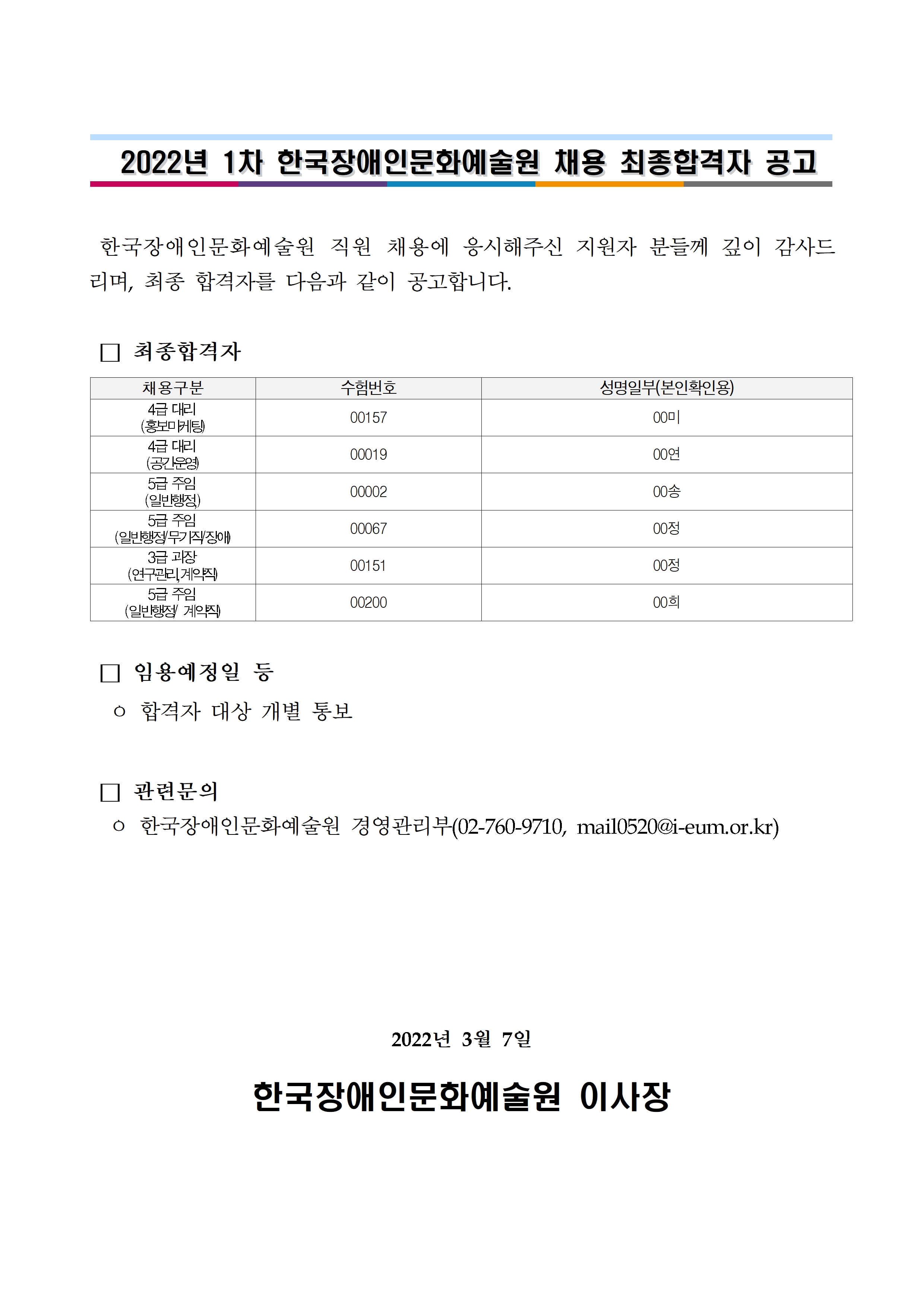 한국장애인문화예술원 2022년 1차 채용 최종합격자 공고