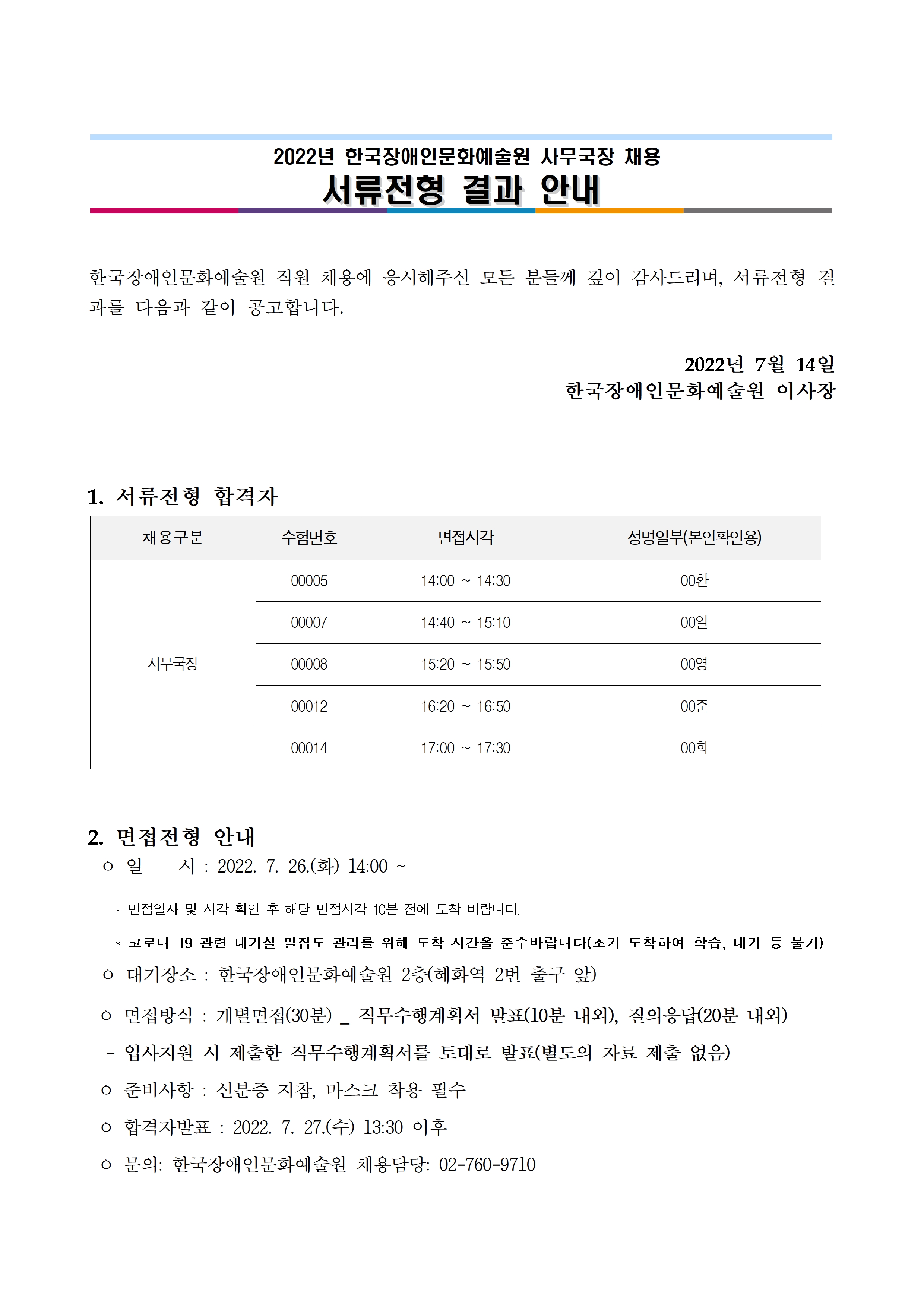 한국장애인문화예술원 사무국장 채용 서류전형 결과