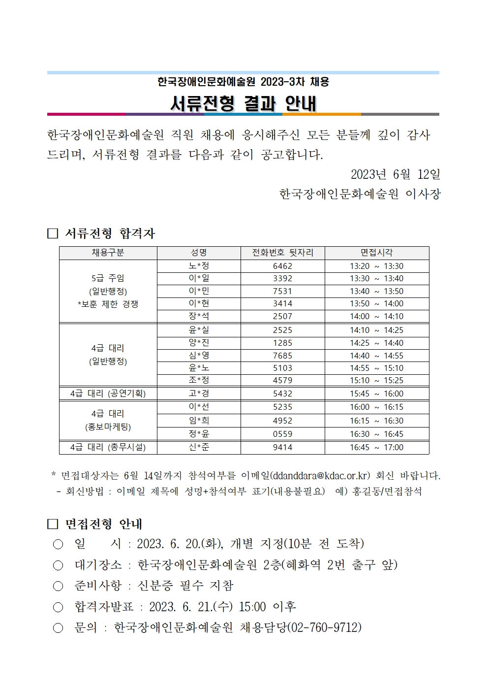 한국장애인문화예술원 2023-3차 채용 서류전형 결과