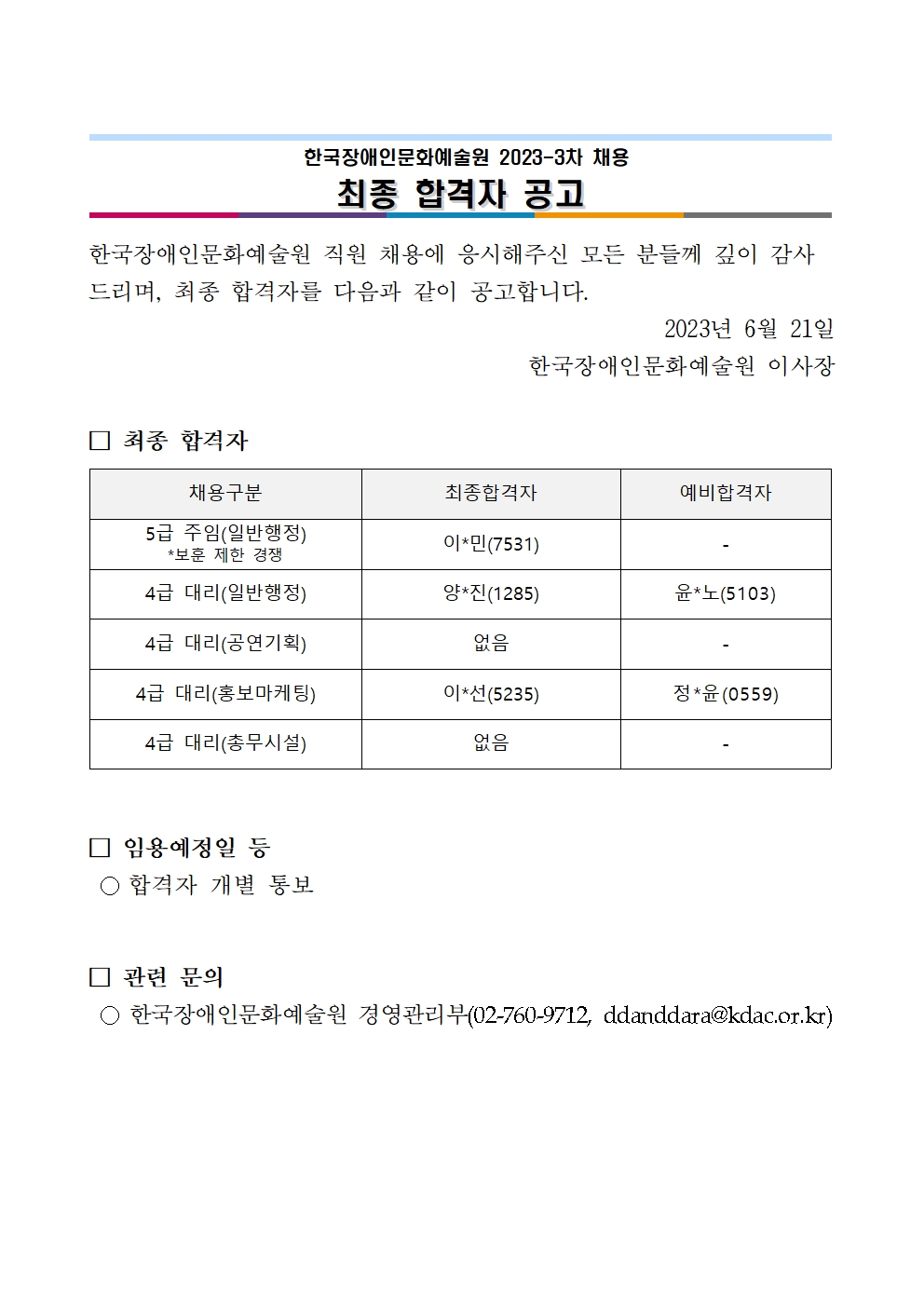 한국장애인문화예술원 2023-3차 채용 최종 합격자 공고