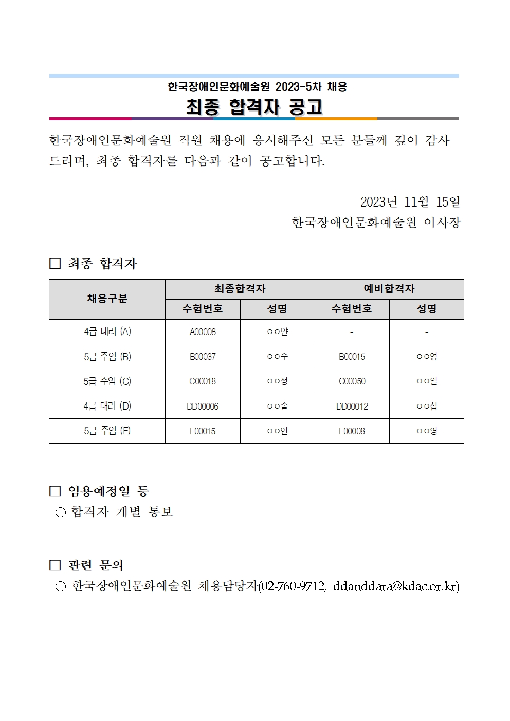 한국장애인문화예술원 2023-5차 채용 최종 합격자 공고