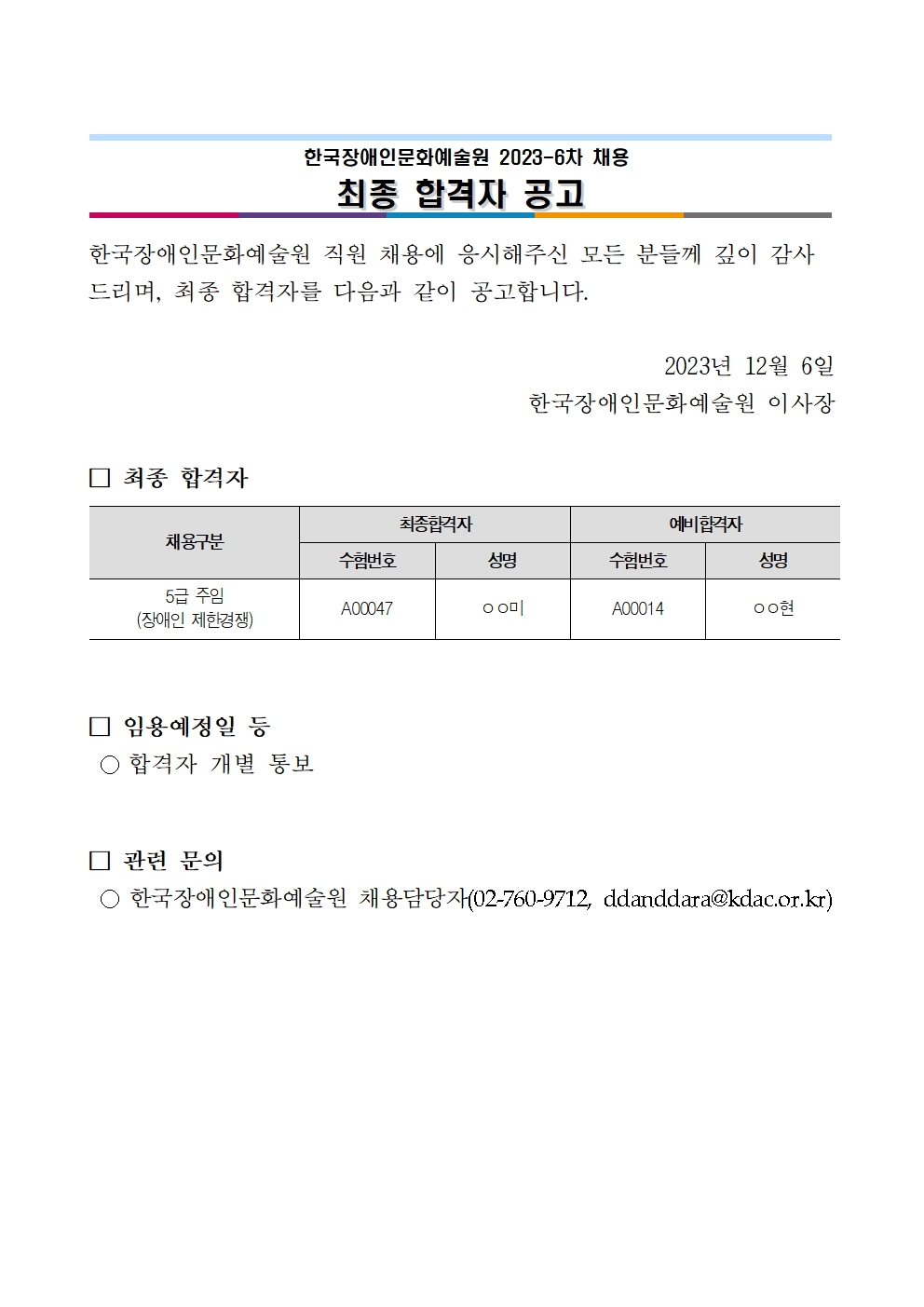 한국장애인문화예술원 2023-6차 채용 최종 합격자 공고