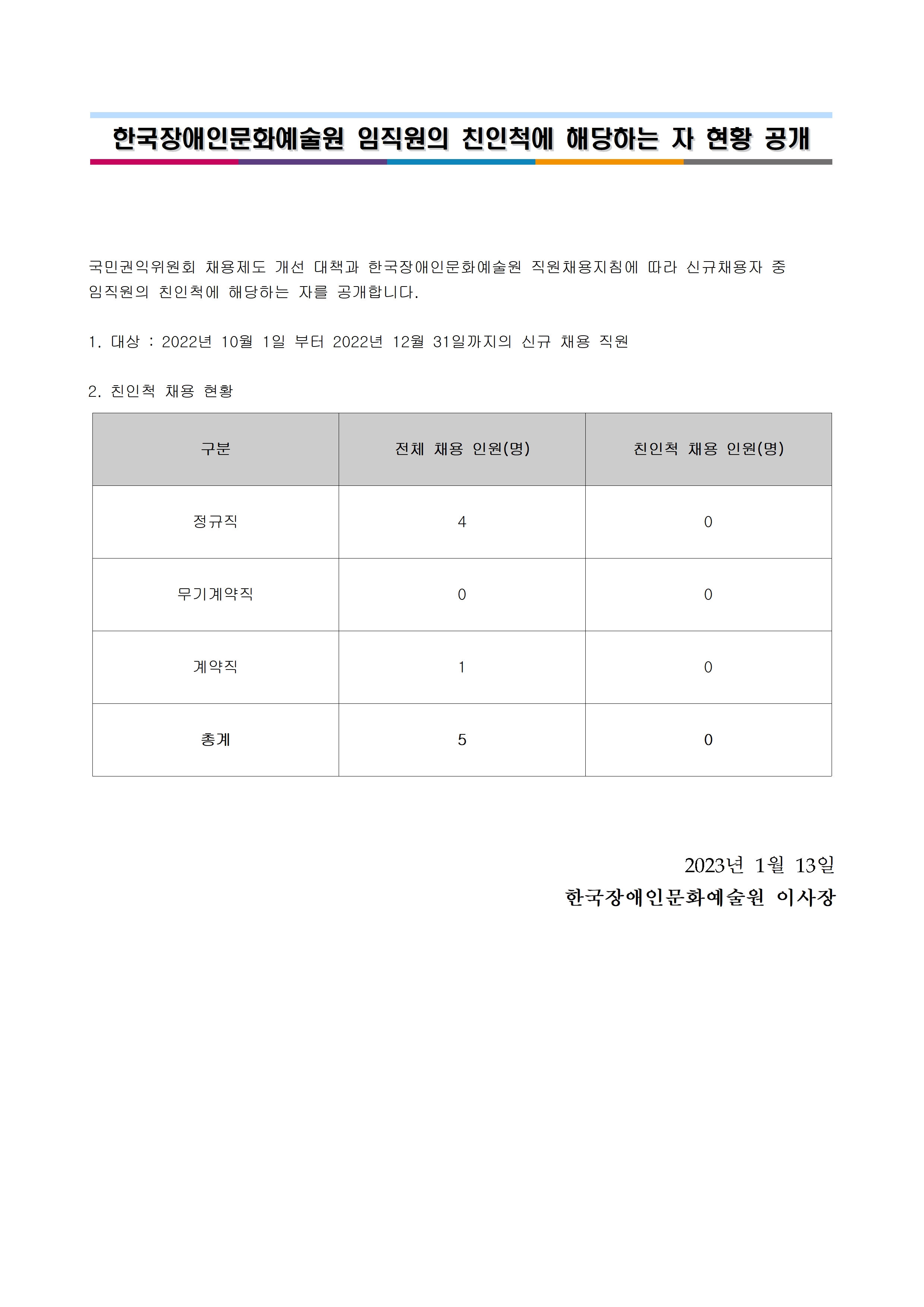 2022년 4분기 한국장애인문화예술원 임직원의 친인척에 해당하는 자 현황 공개