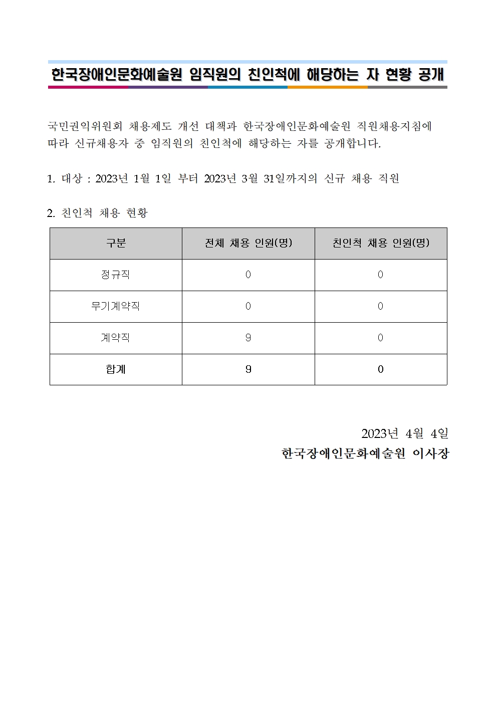 2023년 1분기 한국장애인문화예술원 임직원의 친인척에 해당하는 자 현황 공개