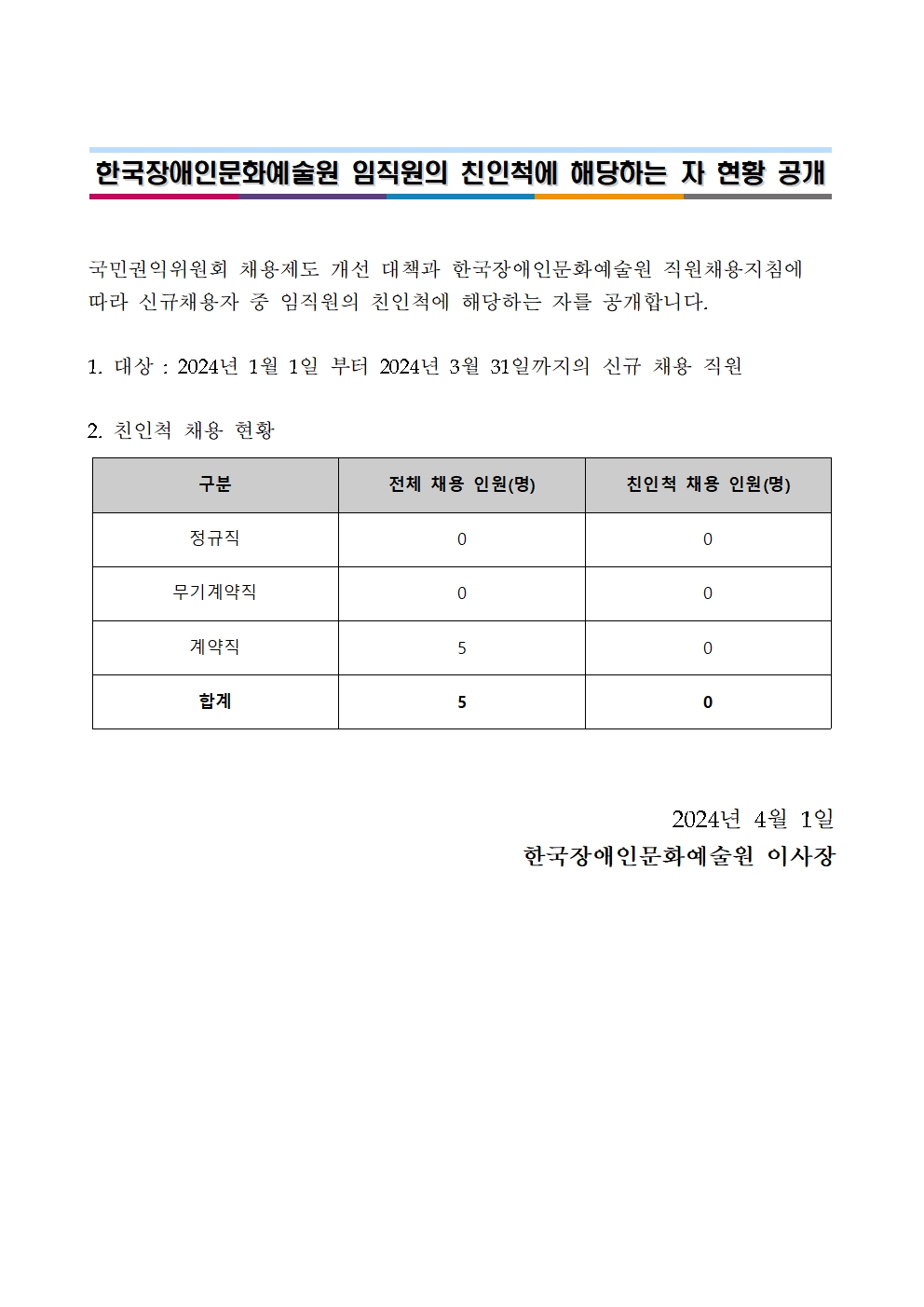 2024년 1분기 한국장애인문화예술원 임직원의 친인척에 해당하는 자 현황 공개